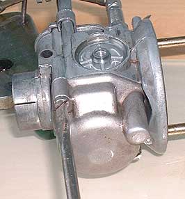 You can see there is a brown paper gasket on the underside of the throttle assembly. If it's in bad condition it must be replaced. It's probably a good idea to replace it as a matter of course. One of these comes in every replacement smallframe gasket set. You can also see there is a cork gasket running round the air intake where it meets the air filter. One of these should also be in every gasket kit. Some smaller carbs may use a paper gasket here, but as I don't have one I can't confirm or deny it.