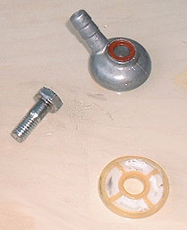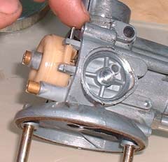 The large white doughnut is the float which, as you would expect, floats. Be very careful with this as it is imperative that it remains intact — after all it cannot float if there are holes in it. The brass screw in the centre is the main jet, and in the corner is the starter jet. The main jet meters the fuel available when the engine is running normally, and the starter jet meters the fuel when the choke is engaged.