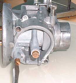 All this does is open the airway up. Air, being sucked through the carb by the engine, passes through this chamber (the Venturi) at high speed, and as it does it drags the fuel mix with it. The slide blocks off this passage, thereby literally throttling the airflow. You should also be able to see how the idle screw, located in the throttle activating arm is a very simple device that physically prevents the throttle slide from closing fully and completely starving the engine or fuel and air. The rate of fuel is controlled by jets. On this type of carb (a constant jet carburettor) the only way of altering the amount of fuel that gets sucked through is by changing the size of the jets. There is a fuel/air mix screw you can see in the bottom of the above picture. This only affects the mix at low revs, and basically controls the size of the opening to the idle jet, thus the effect the passing air has on it, and the amount of fuel it drags through into the airstream. Screw it in and you get the path is closed, causing a leaner mixture, unscrew it and the pathway is opened, so you get a richer mixture. In practice leave it at 2.5 turns out. It will be perfectly fine for most climates. If you do subsequently find it needs adjustment don't go crazy - a half turn to a full turn should cover every eventuality.