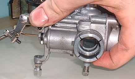 Unscrew the throttle assembly and carefully remove the cover. The throttle spring and slide will come with it. Make sure the spring doesn't ping across the room!